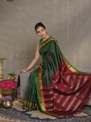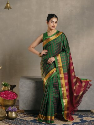 Dark Green Kanjeevarm Silk Saree With Zari Checked Border