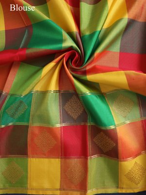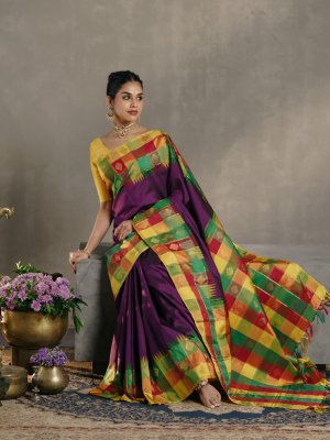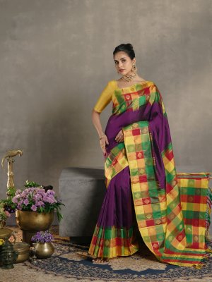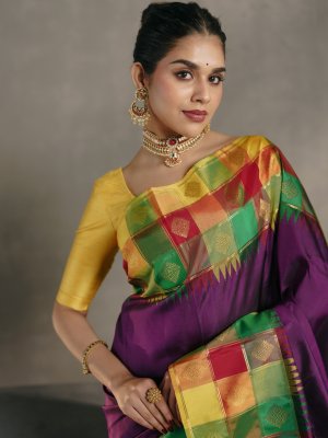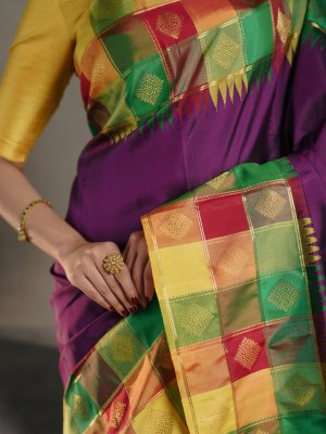 This striking purple Kanjeevaram silk saree is beautifully complemented by a traditional palum pazhamum border, bringing vibrant contrast to the rich body. The border features lively three-color checks in red, mustard yellow, and green, highlighted with zari checks and elegant diamond buttas woven in gold zari. The luxurious purple body enhances the brightness of the border, creating a classic festive appeal. The saree is completed with a matching pallu woven with the same colorful checked pattern, giving it a harmonious and grand finish.