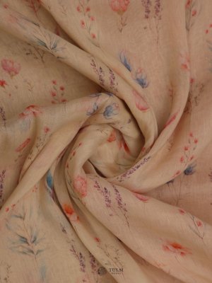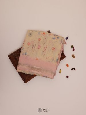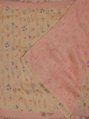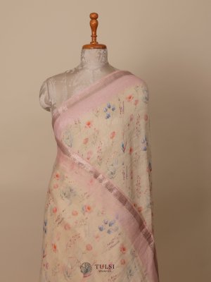 This Cream floral-printed linen saree is ideal for any special event. Crafted from soft linen, it drapes gracefully and offers a comfortable fit. The lively floral designs bring a hint of nature's charm.