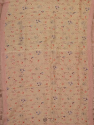 Off-White Linen Saree With Peachy Pink Embroidery Border