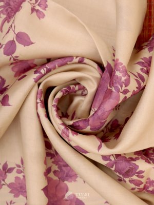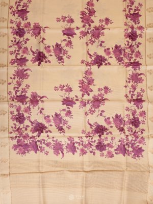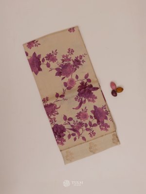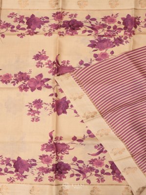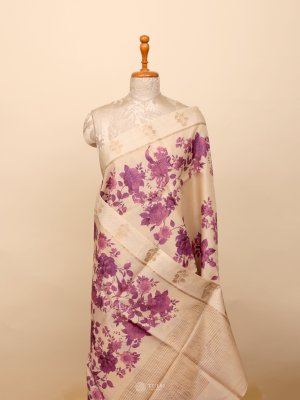 This Cream Tussar Silk Saree exudes timeless elegance with its rich purple floral detailing and soft, lustrous drape. The harmonious blend of cream and violet tones adds a regal charm, perfect for festive celebrations or refined daytime occasions. Graceful, lightweight, and effortlessly sophisticated, it brings classic beauty to every ensemble.