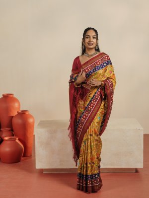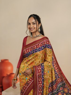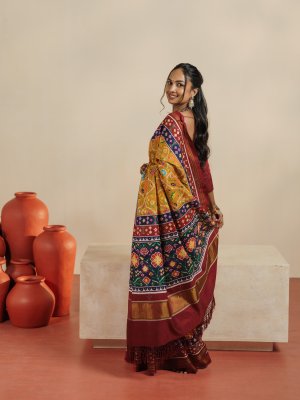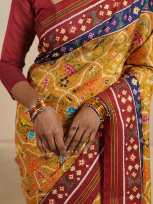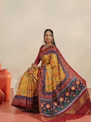 This mustard yellow Patan Patola silk saree featuring a rich and vibrant interplay of colors and intricate traditional designs. The body is adorned with finely woven multicolor motifs in hues of green, blue, pink, and white, forming classic geometric and floral patterns that reflect the beauty of Patola craftsmanship. The deep dark red border adds a striking contrast, enhanced with delicate zari lines and small woven motifs. The pallu carries bold, detailed patterns with a mix of florals and geometric elements in complementing colors, giving the saree a grand and elegant finish.
