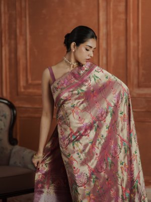 This burgundy Paithani silk saree is beautifully enriched with multicolour floral vine motifs, where soft shades of pink, green, and gold stand out against the deep burgundy base. The gentle contrast of these hues brings vibrancy while maintaining an elegant balance. The border features complementing Paithani patterns in gold zari tones, adding a subtle festive glow. Together, the rich burgundy silk and delicate colour accents create a timeless, graceful drape with classic heritage appeal.