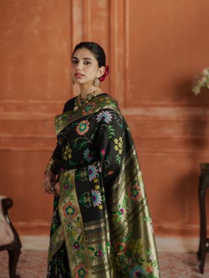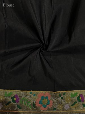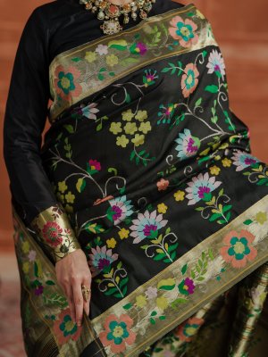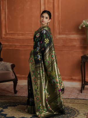 This elegant black Paithani silk saree is woven in the traditional Paithani weave using pure silk and rich zari, offering a graceful and luxurious drape. The deep black body is adorned with vibrant multicolour floral and vine motifs in shades of green, peach, pink, yellow, and teal. A classic gold zari border enriched with colourful floral detailing adds to its regal appeal. Ideal for festive occasions and weddings, this saree beautifully reflects timeless craftsmanship and elegance.