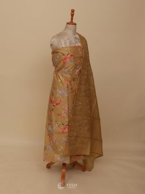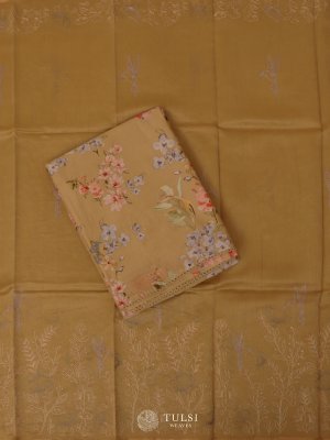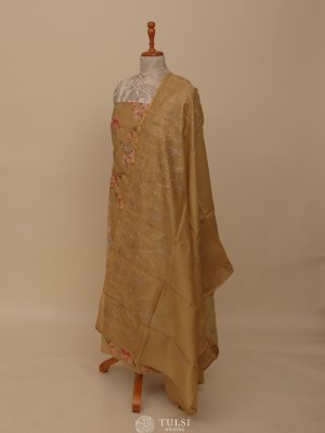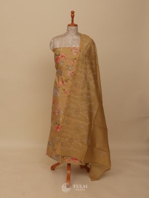 This Dark Beige Chanderi Salwar Material captures timeless sophistication with its soft texture and graceful drape. The fabric showcases a delicate floral weave paired with a beautifully patterned dupatta, creating a balanced blend of tradition and style.