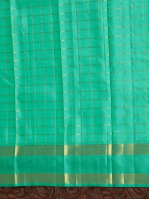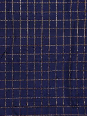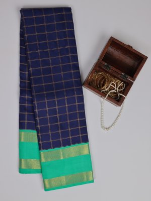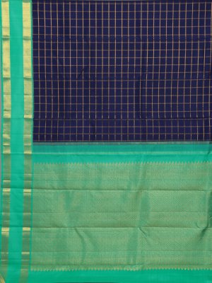 Description This dark blue checked Kanjeevaram silk saree features a rich silk body adorned with elegant gold zari checks, adding depth and classic charm. It is beautifully finished with a contrasting turquoise green double border, lending a refreshing pop of color and enhancing its traditional elegance, making it ideal for weddings and festive occasions.