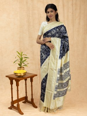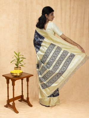 This handwoven ikat silk saree has dark blue geometric ikat patterns adorning the body. It is paired with a cream zari border.