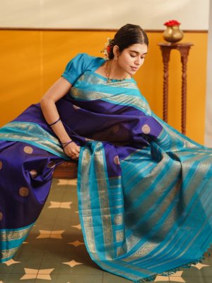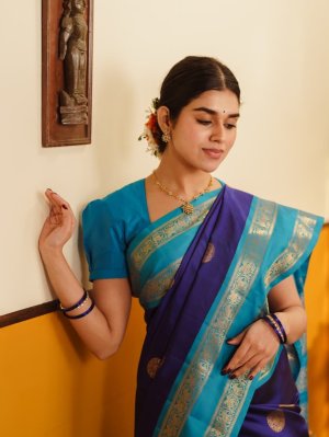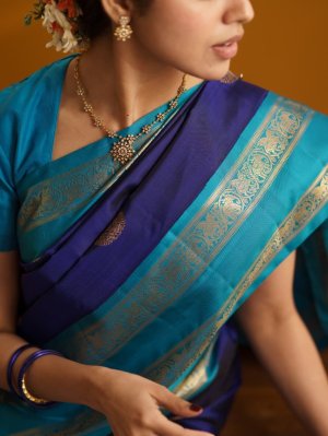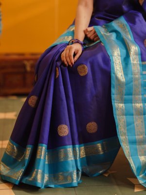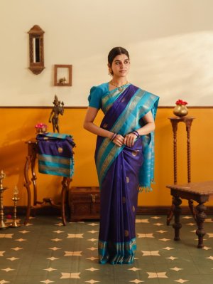 This Dark Blue Kanjeevaram Silk Saree captures the essence of timeless artistry. The body gleams in a rich, royal hue, adorned with intricate golden buttas that shimmer like stars scattered across a midnight sky. Framed by an enchanting Ananda blue border woven with fine zari, it radiates an old-world grace reminiscent of vintage heirlooms. Each thread tells a story of tradition and devotion, making this saree a treasure for those who cherish the elegance of a bygone era.