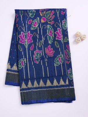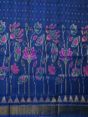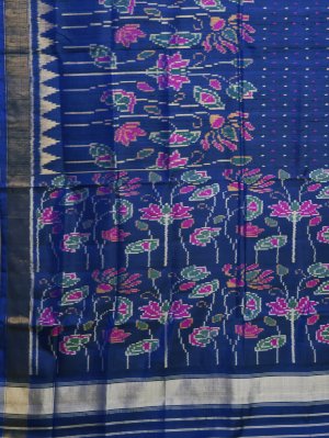 This Dark Blue Patola Silk saree features an exquisite body and pallu adorned with a vibrant lotus field motif, showcasing intricate flowers, leaves, and stems. The elegant composition is framed by a traditional zari border that adds a touch of timeless sophistication to the rich silk fabric. Perfect for weddings and festive occasions, this drape combines heritage artistry with a deep, regal color palette.
