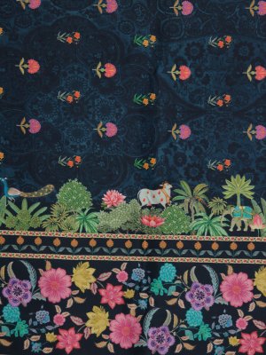 Description This stunning dark blue printed Kanjeevaram silk saree is adorned with intricate nature-inspired patterns, blending floral and foliage motifs in vibrant shades of green, pink, coral, mustard, and soft teal. The deep blue base beautifully enhances the detailed prints, giving the saree a regal yet contemporary appeal. Accentuated with a matching blue border highlighted by subtle gold zari lines, this saree reflects a perfect harmony of traditional Kanjeevaram silk and modern artistic design. Ideal for festive gatherings and refined occasions.