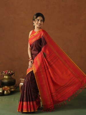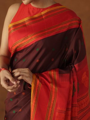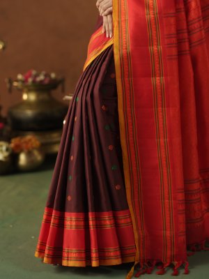 This Dark Brown Gadwal Silk saree envelopes the wearer in a dense, lustrous fabric finished with a structured Red border of high tensile strength and intricate manga motifs. Small green and orange buttas provide a tactile depth across the body, while the heavy red pallu exhibits a matte sheen through vertical linear patterns and substantial zari work. Delicate tassels add a refined weight to the finish, ensuring the drape holds its shape with a regal, metallic-tinted edge.