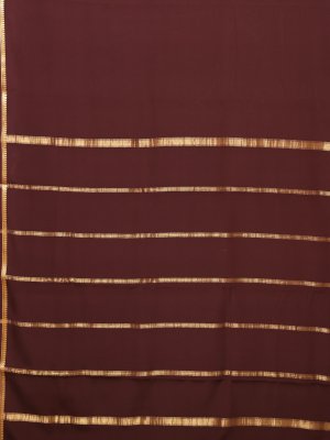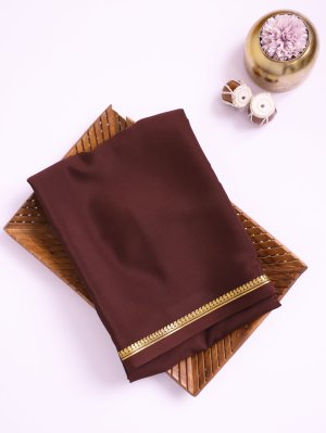 This Dark Brown Mysore Silk saree seamlessly blends traditional Indian heritage with a modern, minimalist aesthetic. Its deep espresso tone is elegantly elevated by subtle metallic gold stripes, offering a look that is both sophisticated and timeless.