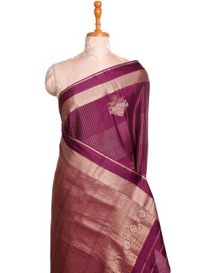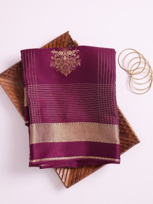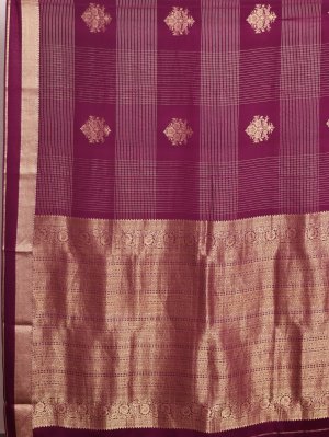 This dark burgundy Mysore silk saree radiates sophistication and positivity with its rich, deep hue. Adorned with delicate floral buttas and subtle zari checks, it reflects timeless charm and regal grace. Drape elegance with this soft, lightweight, and comfortable saree, designed to offer ease and confidence throughout the day. Perfectly versatile for festive occasions or special celebrations, it is a true blend of style and tradition.