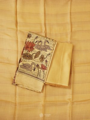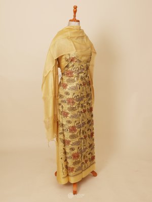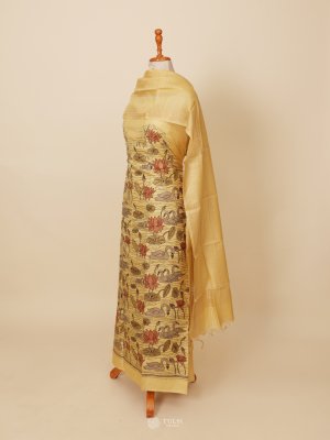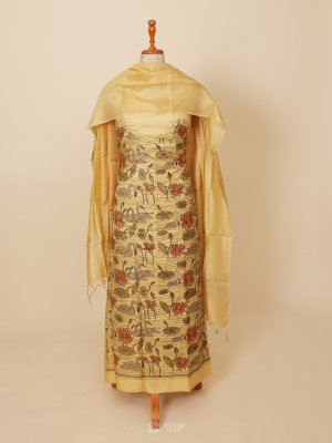 This Dark Cream Tussar Salwar Material features elegant hand-done Kantha embroidery, adding a touch of traditional charm. Made from pure Tussar silk, it has a natural sheen and rich texture that feels both classic and refined. Ideal for festive or casual wear, it offers a timeless ethnic look with understated grace.