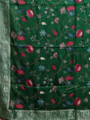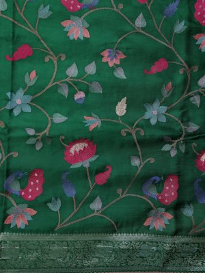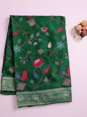 This dark green crepe silk saree features a lush, verdant palette that represents growth and timeless prosperity. It is adorned with vibrant peacock and botanical floral motifs, tied together by a traditional zari border for a touch of classic luxury. Crafted for a soft, fluid silhouette, this piece is a sophisticated choice for weddings, traditional ceremonies, and grand festive gatherings.