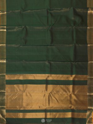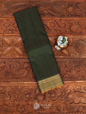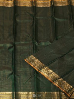 This Dark Green Kanjeevaram Silk Saree, a refined piece woven with the intricate vaira oosi technique. The rich Dark Green body is complemented by a lustrous gold zari border and pallu, adding a regal charm to its traditional appeal. Crafted from pure silk, this saree captures the perfect blend of sophistication and heritage.