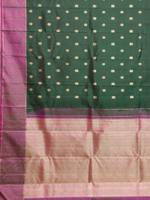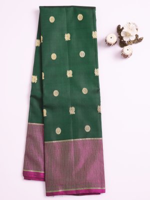 This elegant Kanjeevaram silk saree in a rich dark green is adorned with intricate mayil chakram zari buttas, giving it a regal allure. The grape-colored border with subtle zari checks adds a refined contrast. The pallu showcases traditional motifs, perfectly matched with a grape-colored blouse for a sophisticated finish.