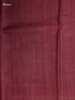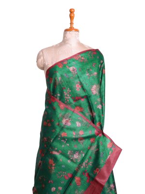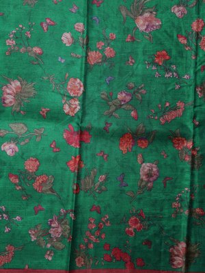 This Dark Green Printed Tussar Silk Saree features a rich, textured body adorned with vibrant floral and butterfly prints in shades of rose, orange, and lilac. The structural detail is defined by a solid contrasting brown border that provides a clean, matte frame to the lightweight fabric. The pallu is finished with a simple, elegant fold that mirrors the border’s deep brown tone, ensuring a cohesive and polished look for formal or festive occasions.