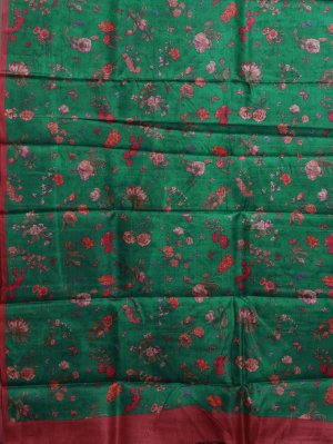 Dark Sage Green Printed Tussar Silk Saree With Satin Border