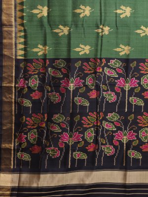 This Dark Green Patola Silk saree features a sophisticated black border and pallu, creating a striking traditional contrast. The body is adorned with intricate golden leaf motifs, while the black pallu showcases a vibrant lotus field inspiration with pink flowers and green leaves. Every inch reflects master craftsmanship through its detailed Zari borders and traditional Patola weaving.