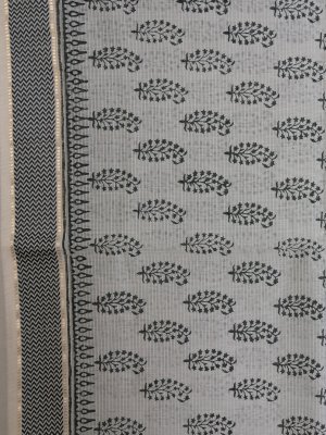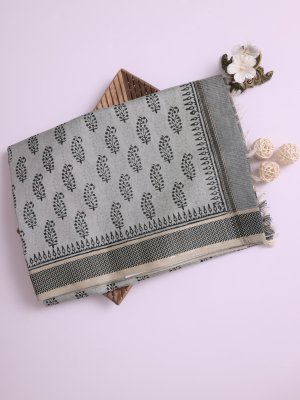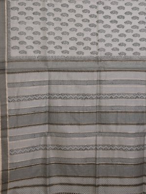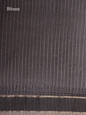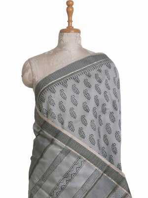 This graceful Dark grey Maheshwari cotton saree features a soft and elegant base that is perfect for everyday sophistication. The body is adorned with subtle black printed designs, adding a refined artistic touch. A calm beige border beautifully frames the saree, enhancing its understated charm. Lightweight and breathable, it offers comfort along with timeless style. Ideal for casual wear and simple occasions.