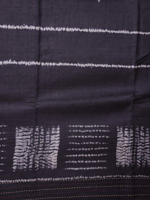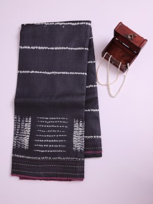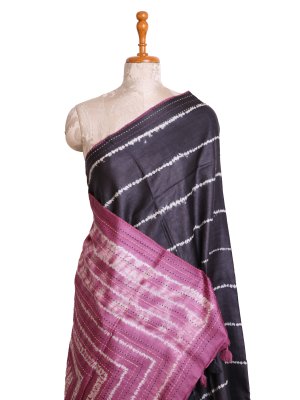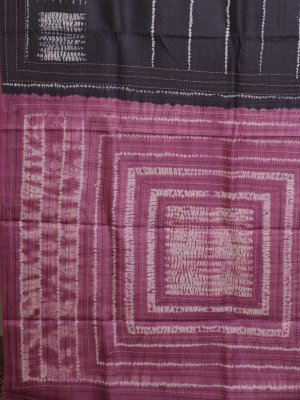 This Dark Grey Printed Tussar Silk saree features a striking body adorned with white horizontal shibori stripes. The elegant border is defined by traditional hand-stitched accents that lead to a vibrant lilac pink pallu showcasing concentric geometric squares. This unique ensemble offers a perfect blend of rustic handloom charm and contemporary artistic design for any special occasion.