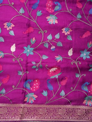 This dark magenta crepe silk saree radiates a bold, berry-toned palette that embodies modern charm and artistic passion. It is beautifully adorned with vibrant peacock and floral motifs, paired with a classic gold zari border for a touch of refined heritage. Tailored for an effortless, flowing drape, this piece is an elegant choice for weddings and celebrations