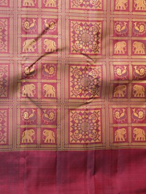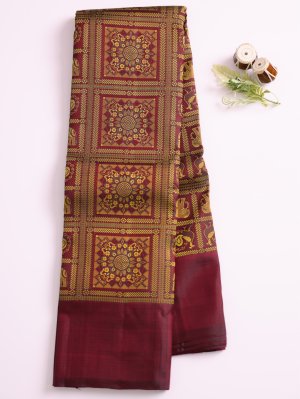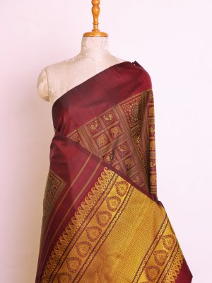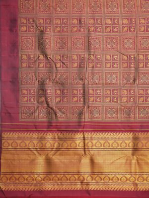 Wine Red Checked Kanjeevaram Silk Sarees With Maroon Border