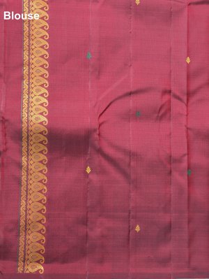 This exquisite Checked Threadwork Kanjeevaram Silk Saree in deep maroon showcases a classic checked body adorned with intricate traditional motifs in vibrant green and yellow thread work. The rich interplay of colors enhances its timeless elegance, making it perfect for grand occasions and celebrations. The pallu is beautifully highlighted with opulent zari design patterns, adding a regal touch to the ensemble. Complementing the saree, the blouse features charming yellow and green buttas with detailed zari work, completing the look with graceful sophistication.