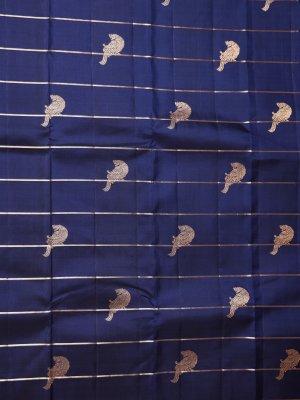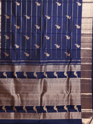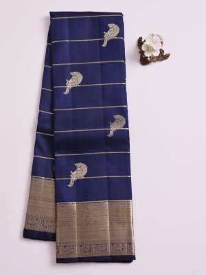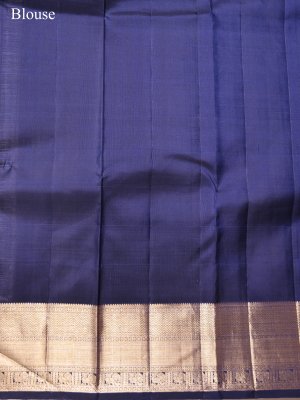 This stunning Kanjeevaram silk saree in deep navy blue showcases an intricately woven body enriched with shimmering zari veldhari detailing and graceful peacock motifs throughout. The border and pallu are highlighted with rich zari patterns and artistic peacock designs, lending a majestic and festive allure. Complemented by a matching self-shade blouse, this ensemble beautifully reflects classic tradition with refined elegance.