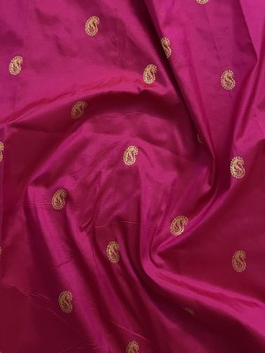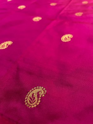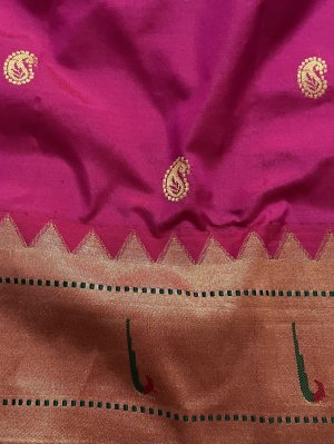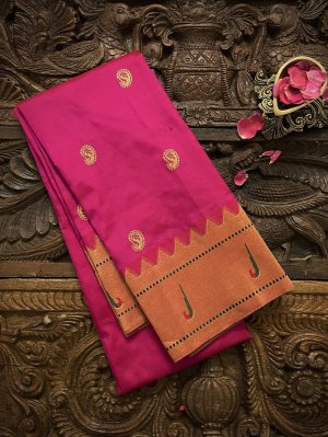 Hand-Woven Dark Pink Paithani Silk Blouse embellished with gold zari motifs paired along with a temple design border with thread detailing.
