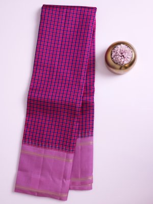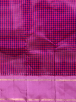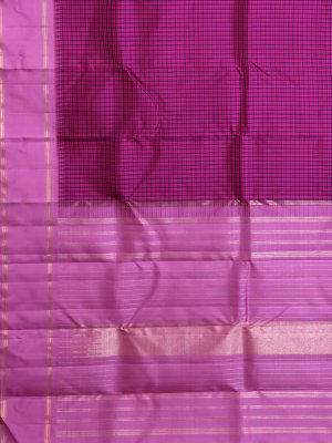 This Vibrant Checked Kanjeevaram Silk Saree features a rich body pattern created by the intersection of Dark Pink & Purple silk threads. It is elegantly framed by a soft Pastel Pink Bodi border and a matching pallu adorned with delicate gold zari horizontal stripes. The contrast between the dark checked body and the refined pastel border offers a timeless look perfect for formal occasions.