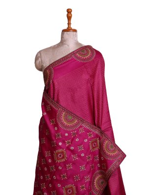 Dark Pink Zari Checked Tussar Silk Saree with Kutch Embroidery