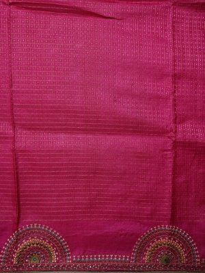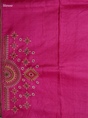 This Dark Pink Tussar Silk saree features a subtle, lustrous body marked by fine zari checked patterns that create a rich depth. The borders and pallu are meticulously adorned with vibrant Kutch embroidery, showcasing intricate diamond threadwork and small mirror work for a striking ethnic look. A delicate pastel green piping provides a clean, colorful finishing to the edges, paired with a matching blouse featuring a detailed embroidery patch on the sleeve.