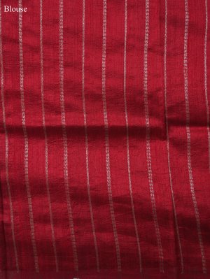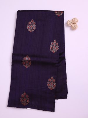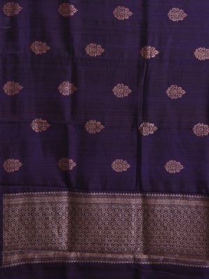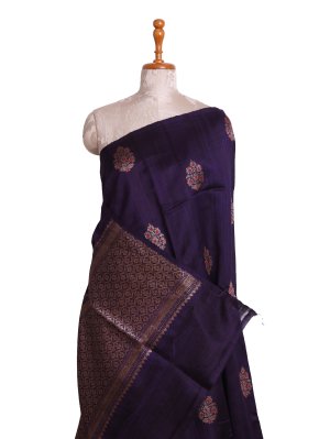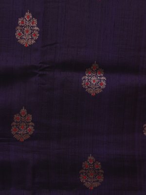 This Dark Purple Banaras Tussar Silk saree highlights a rich, slubbed texture punctuated by vibrant floral buttas in antique gold and crimson threadwork. The fabric transitions into a dense, metallic-toned pallu detailed with intricate geometric lattices and a refined finish. A contrasting red blouse adds a bold counterpoint to the deep body, ensuring a striking silhouette for cultural celebrations.