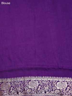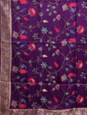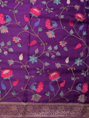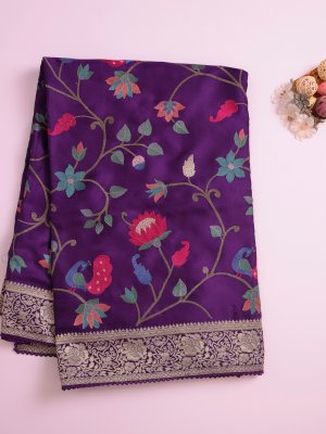 This dark purple crepe silk saree features a rich, regal hue that symbolizes luxury and sophisticated grace. It is intricately detailed with vibrant peacock and floral vine motifs and finished with an ornate gold zari border. Designed for high-impact elegance, it is the ultimate statement piece for weddings and festive celebrations.