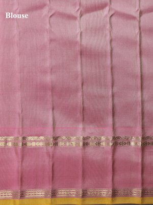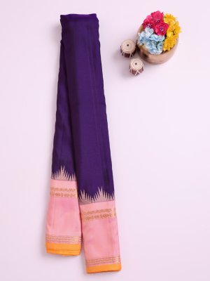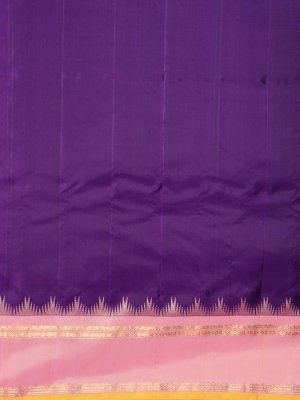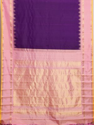This elegant Gadwal Silk Saree boasts a rich dark purple body with a smooth, solid finish. Its light pink contrast border is detailed with traditional Thazampoo temple designs, along with delicate moggu, kamalam, neli, and muthu motifs accented beautifully with a bright yellow jamadu. The pallu is tastefully adorned with subtle solid patterns, giving the saree a regal charm.