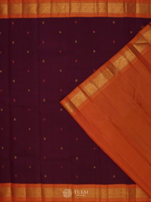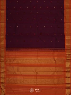 Rich in tradition, this Dark Purple Kanjeevaram Silk Saree features both thread and zari buttis on the body with a contrast korvai border. The bold purple shade brings out a royal and graceful look. A classic drape that blends tradition with graceful sophistication.