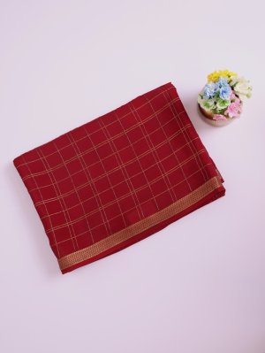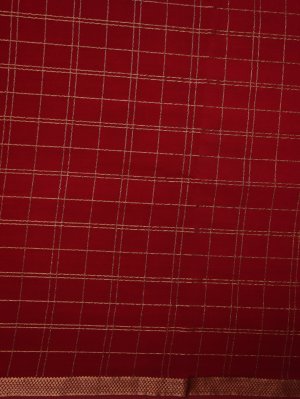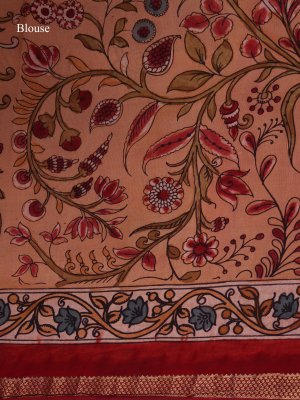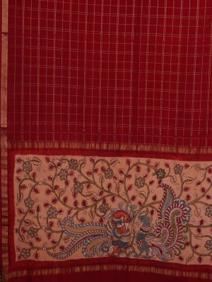This Dark Red Mysore Crepe saree is defined by a fluid, buttery drape featuring an intricate grid of metallic zari checks across the rich red body. The silhouette flows into a statement Kalamkari pallu featuring hand-painted storytelling motifs of peacocks and blooming vines, bordered by a lustrous zari edge. A matching Kalamkari blouse completes the look, blending the smooth, pebbled texture of crepe with the earthy, tonal beauty of traditional art.