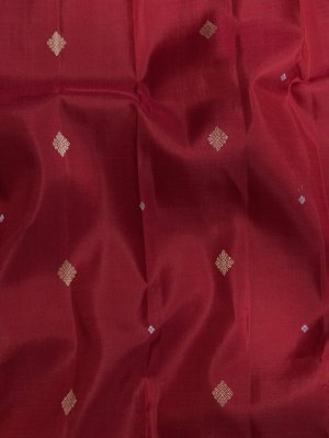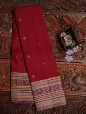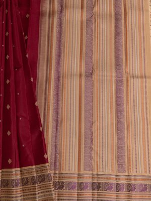 This exquisite dark red Kanjeevaram Pattu Silk saree exudes timeless elegance. The body features delicate beige and grey kamalam buttas that add a subtle, sophisticated charm. A contrasting beige border enhances the richness of the deep red base, creating a striking visual appeal. The pallu and border are adorned with a vibrant mix of purple, orange, and grey pattu pettu, showcasing traditional craftsmanship. Perfect for festive occasions and weddings.
