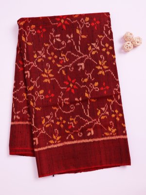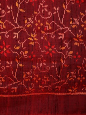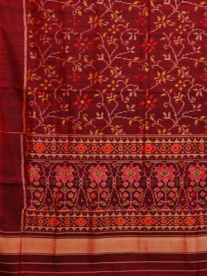 This Dark Red Patola Silk saree features a flowing body adorned with intricate floral vines and a matching dark red border. The pallu is distinctively decorated with elegant flower motifs, creating a cohesive and timeless handwoven look. This sophisticated piece represents the craftsmanship for any special occasion.