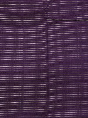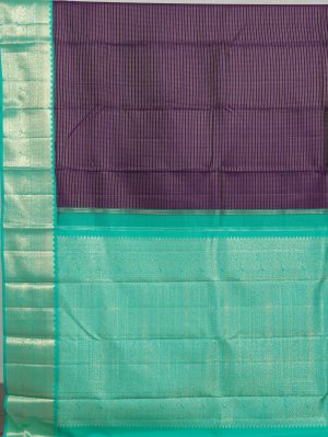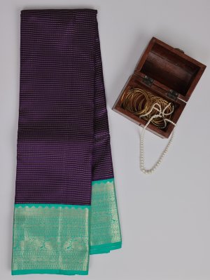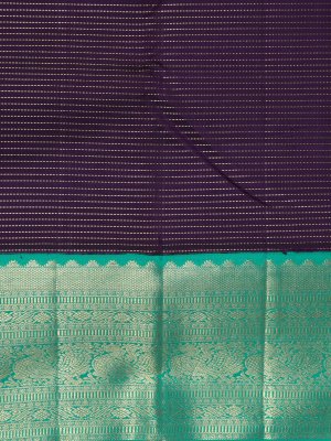 This dark violet Kanjeevaram silk saree carries a refined striped texture that lends depth and quiet elegance to the drape. Pearl-inspired detailing and a contrasting bluish-green border with graceful peacock motifs add a timeless, regal charm—making it perfect for all celebrations.