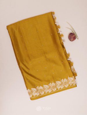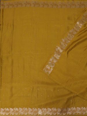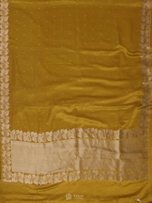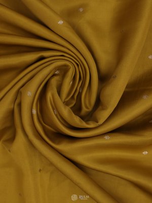 This Dark Yellow Mashru Silk Saree exudes a luxurious charm with its lustrous satin finish and smooth texture. The saree features intricate silver zari motifs across the body, beautifully complemented by an ornate silver border and pallu. The rich Red hue enhances its regal allure, making it a timeless choice for festive and formal occasions.