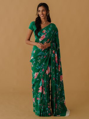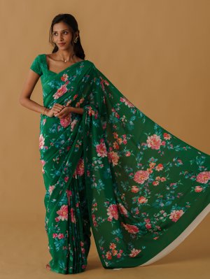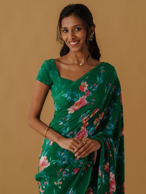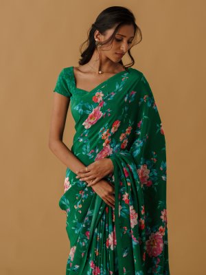 This Deep Green Crepe Silk Saree exudes elegance with a playful touch of color. The lush green fabric is adorned with vibrant floral patterns in pink, blue, orange, light green, and yellow, adding a cheerful yet refined charm. Made from smooth, weightless crepe silk, it drapes effortlessly, giving a graceful silhouette. Ideal for festive events or celebrations, this saree beautifully balances style and comfort. Its lively floral motifs make it a standout piece for any wardrobe.