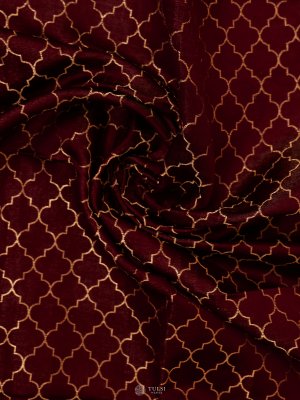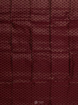 This Deep Maroon Banaras Silk Blouse is adorned with refined gold zari motifs, exuding classic sophistication. The rich maroon shade adds depth and opulence, ideal for creating a regal festive look.