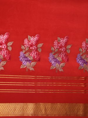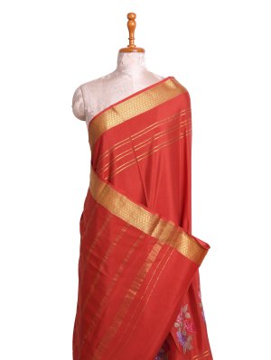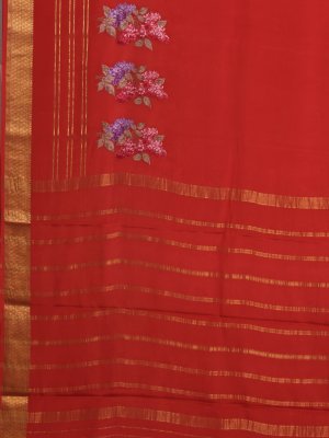 This Deep Orange Mysore Crepe Silk saree flows with a liquid-like grace, showcasing intricate cross-stitch floral clusters in lilac and red across the grainy texture of the body. A structured gold zari border anchored by geometric diamond patterns frames the drape, leading to a pallu defined by crisp metallic bands and a continuation of the botanical embroidery. The ensemble is completed with a matching orange silk blouse piece, ensuring a seamless and regal look for celebrations.