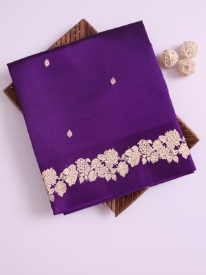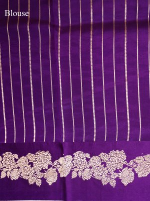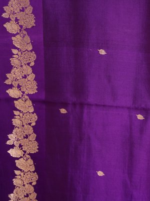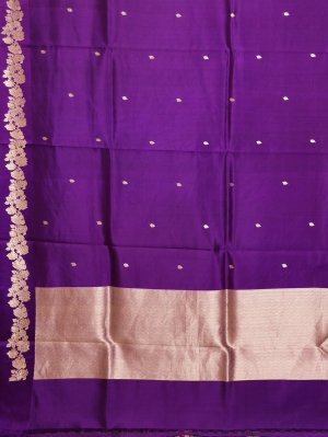 This deep violet Mashru saree is a beautiful mix of style and comfort. It features a shiny silk surface on the outside and soft cotton on the inside, making it feel great to wear. The dark purple color looks very royal and makes the gold floral borders and small dots shine brightly. Because the fabric is thick and high-quality, it drapes perfectly and holds its shape all day long. It is a classic and elegant choice for weddings or special celebrations.