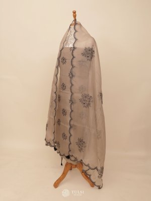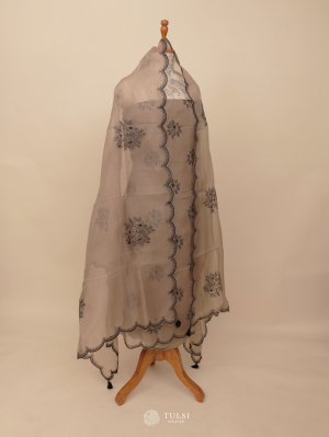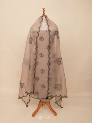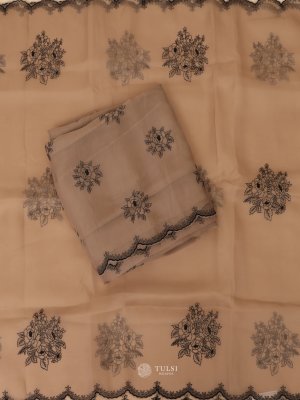 This Elegant Dusty Brown Organza Salwar Material features delicate black floral embroidery, adding a graceful contrast to the soft base. The sheer organza fabric is lightweight and airy, making it perfect for festive or special occasions. The scalloped embroidered border enhances its charm, giving the attire a refined and stylish finish. Ideal for creating a classy and timeless ethnic look.
