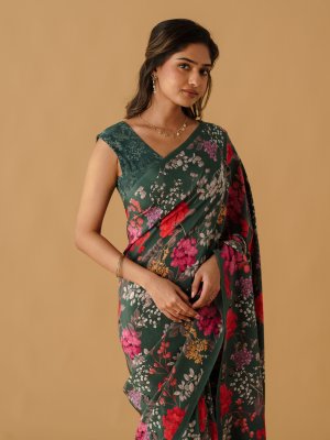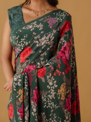 Bottle Green Printed Crepe Silk Saree