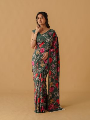This dusty dark green crepe silk saree exudes understated elegance with its soft, fluid drape and refined finish. Delicate floral motifs in rich reds, pinks, and muted ivory bloom gracefully across the deep green base. Lightweight yet luxurious, it offers effortless comfort while maintaining a polished, sophisticated look. It pairs with a classic blouse for a timeless, refined ensemble.